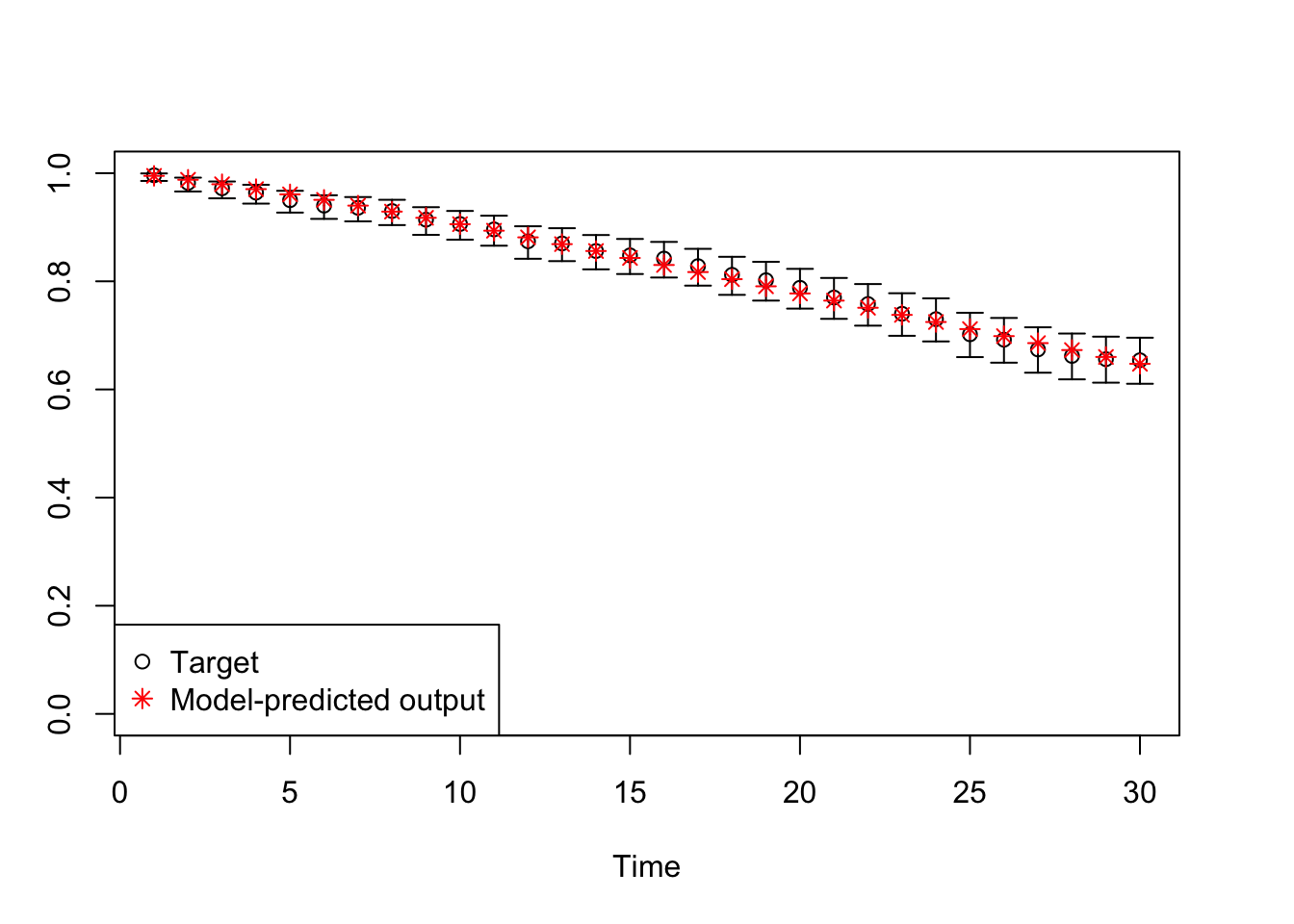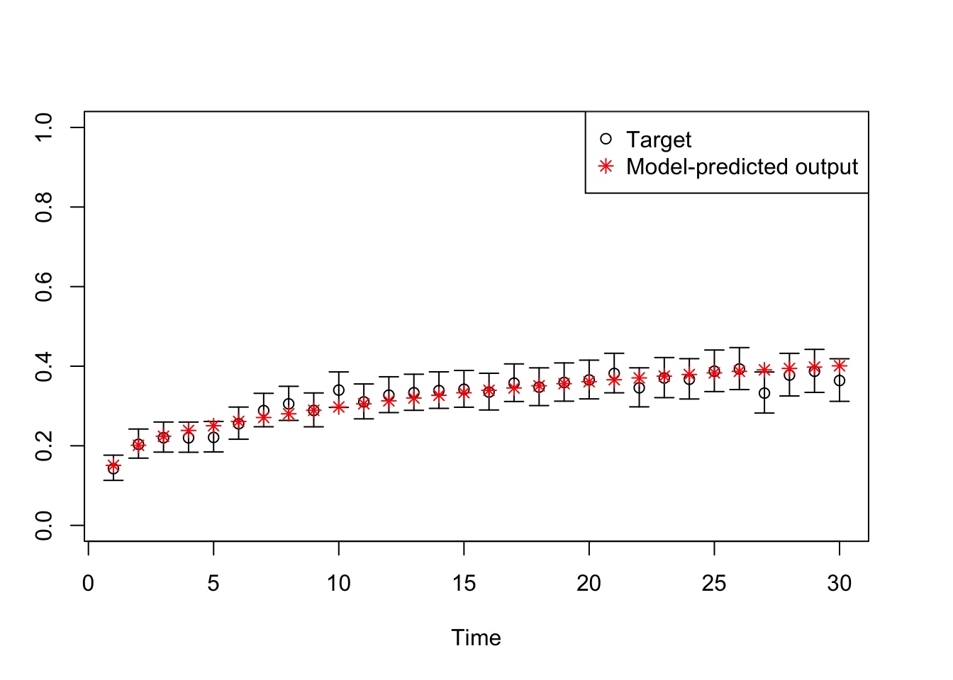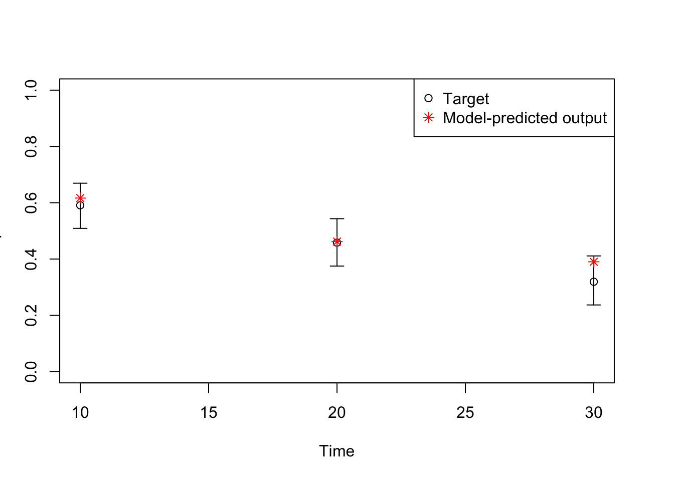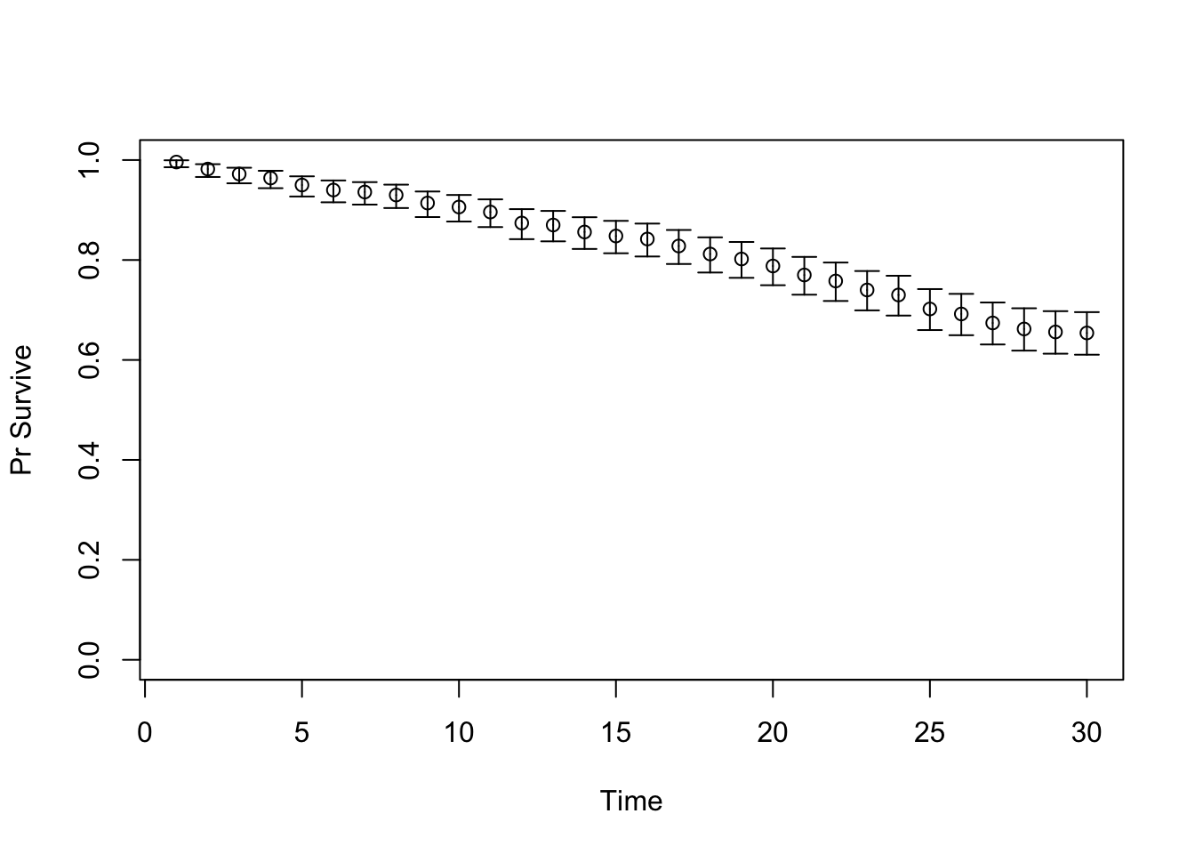 # TARGET 3: Proportion who are Sick ("PropSick"), among all those afflicted (Sick+Sicker)plotrix::plotCI(x = lst_targets$PropSick$time, y = lst_targets$PropSick$value,ui = lst_targets$PropSick$ub,li = lst_targets$PropSick$lb,ylim =c(0, 1),xlab ="Time", ylab ="PropSick")